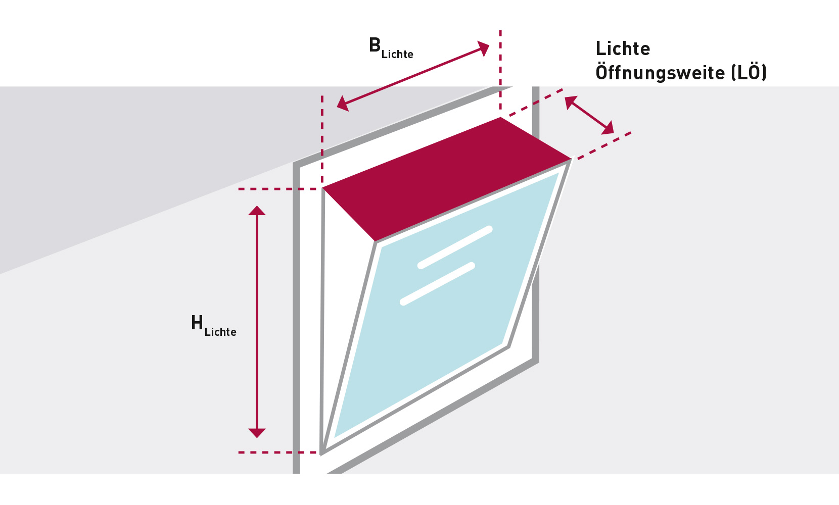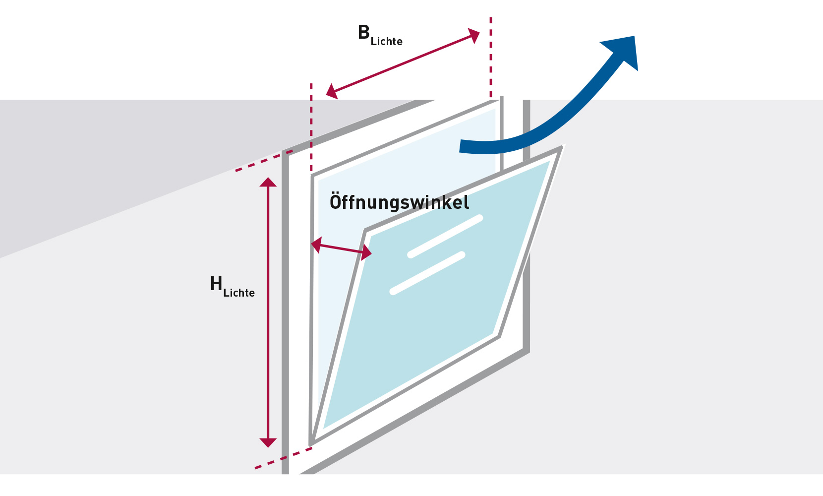 Ist der Öffnungswinkel größer 60°, wird der errechnete Wert A mit der maximalen lichten Fensteröffnungsfläche HLichte BLichte angesetzt.